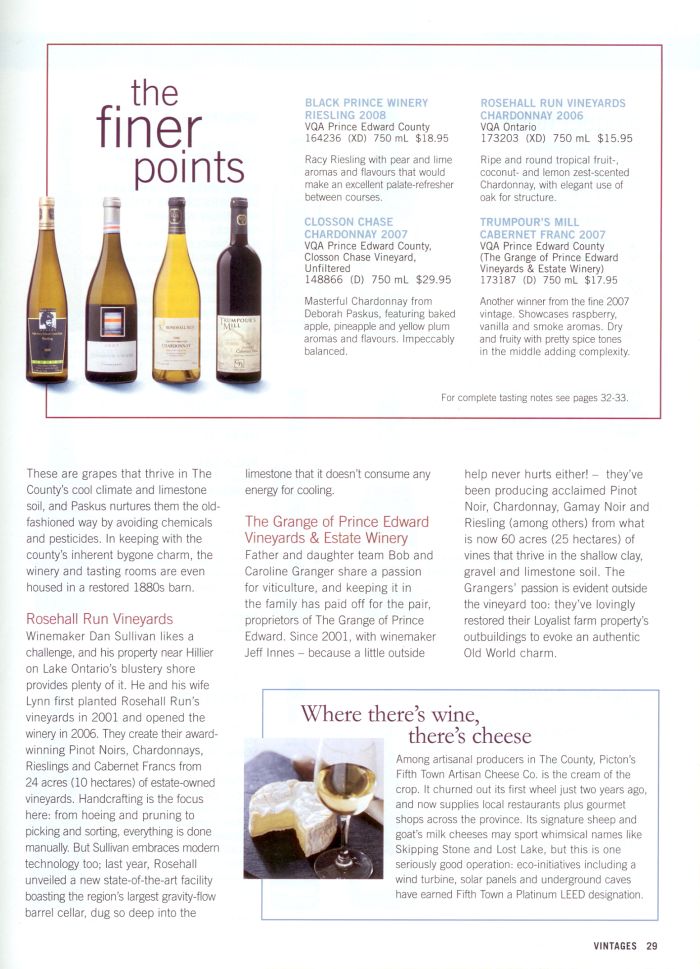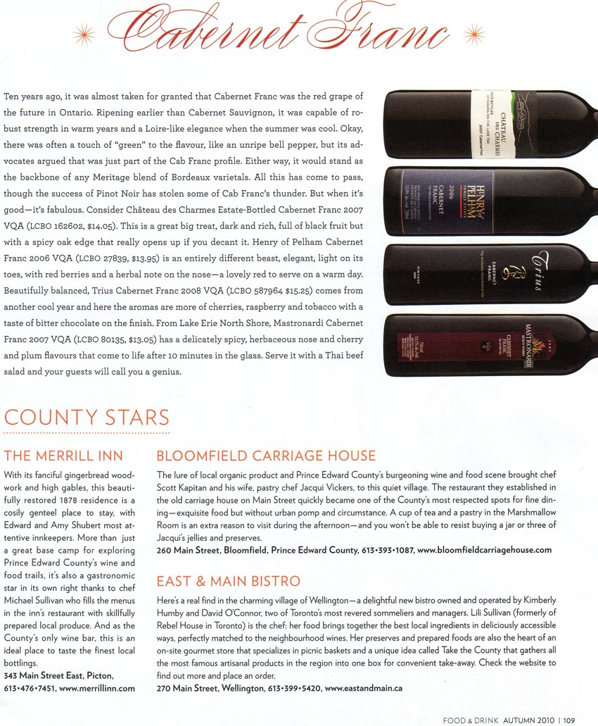 Prince Edward County wines were featured in Vintages May 2010. The Merrill Inn features a vast selection of hand-crafted wines from Prince Edward County. Page 1 | Page 2 | Page 3 |