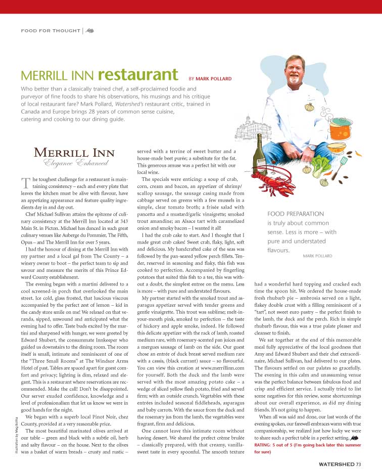 | Watershed Magazine "Chef Michael Sullivan attains the epitome of culinary consistency at the Merrill Inn. When all was said and done, our last words of the evening spoken, our farewell embraces warm with true companionship, we realized just how lucky we were to share such a perfect table in a perfect setting. RATING: 5 out of 5 (I'm going back later this summer for sure)" Read the full article |